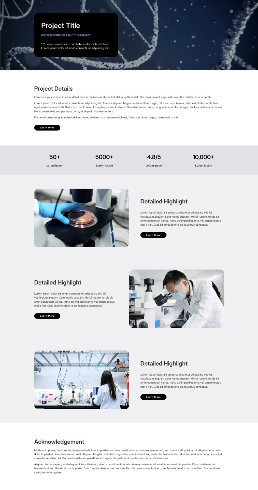 A full page template pattern. Includes a banner, overview section, stats section, 3 related items section, and acknowledgement section. Sections can be edited or…